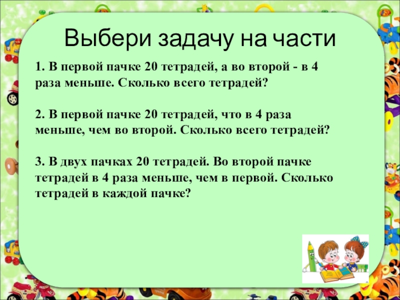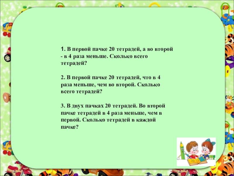 2. В первой пачке 20 тетрадей, что в 4 раза меньше, чем во второй. Сколько всего тетрадей?