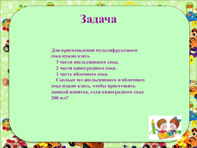 Сколько мл апельсинового и яблочного сока нужно взять, чтобы приготовить данный напиток, если виноградного сока 200 мл?