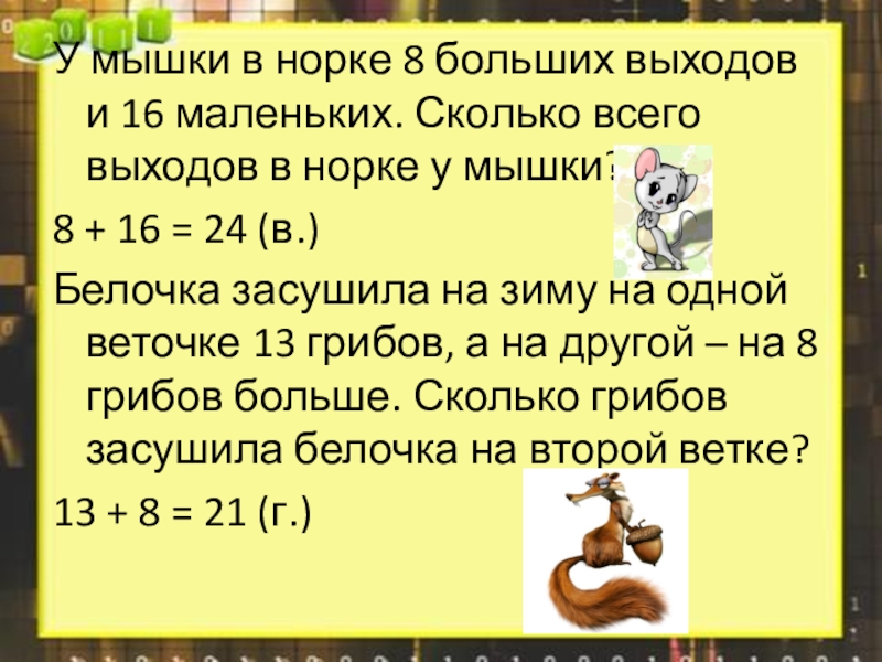 У мышки в норке 8 больших выходов и 16 маленьких. Сколько всего выходов в норке у мышки?8 + 16 = 24 (в.)Белочка засушила на зиму на одной веточке 13 грибов, а на другой – на 8