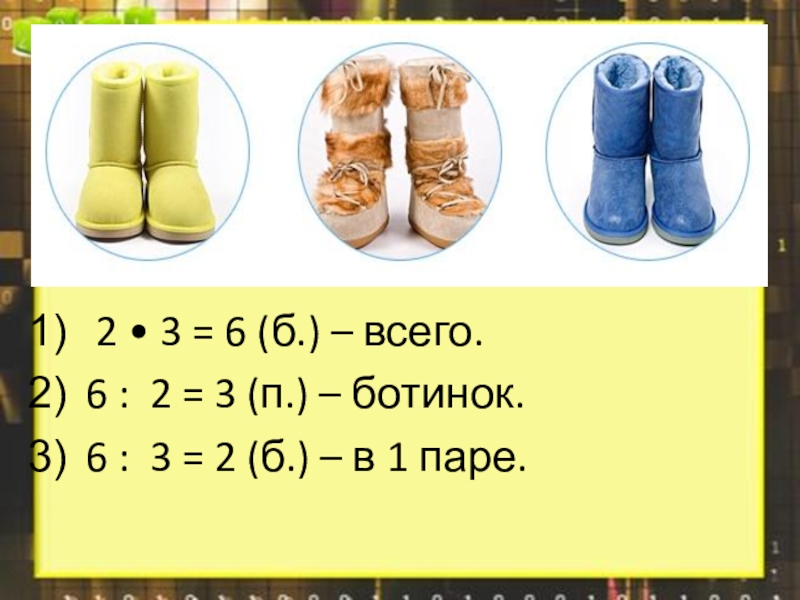 2 • 3 = 6 (б.) – всего.6 : 2 = 3 (п.) – ботинок.6 :