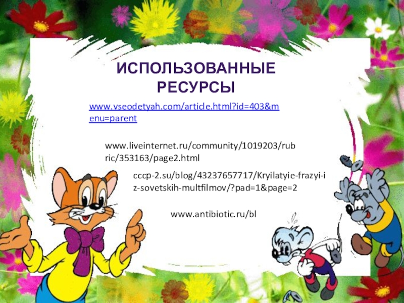 www.vseodetyah.com/article.html?id=403&menu=parentиспользованные ресурсыwww.antibiotic.ru/blwww.liveinternet.ru/community/1019203/rubric/353163/page2.htmlcccp-2.su/blog/43237657717/Kryilatyie-frazyi-iz-sovetskih-multfilmov/?pad=1&page=2