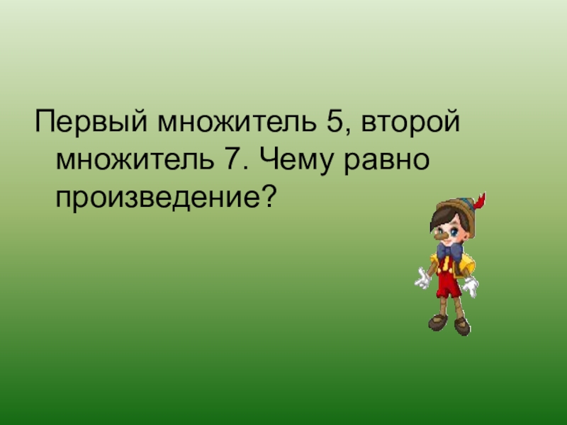 Слайд 3Первый множитель 5, второй множитель 7. Чему равно произведение?