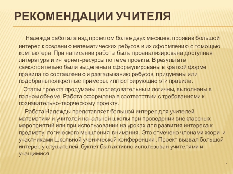 Работа Надежды представляет большой интерес для учителей математики и учителей начальной школы при проведении внеклассных мероприятий или при использовании на уроках для развития интереса к предмету, логического мышления, внимания. Это отмечено членами жюри и участниками Школьной ученической конференции . Проект вызвал большой интерес у слушателей, буклет был активно использован учителями и учащимися.