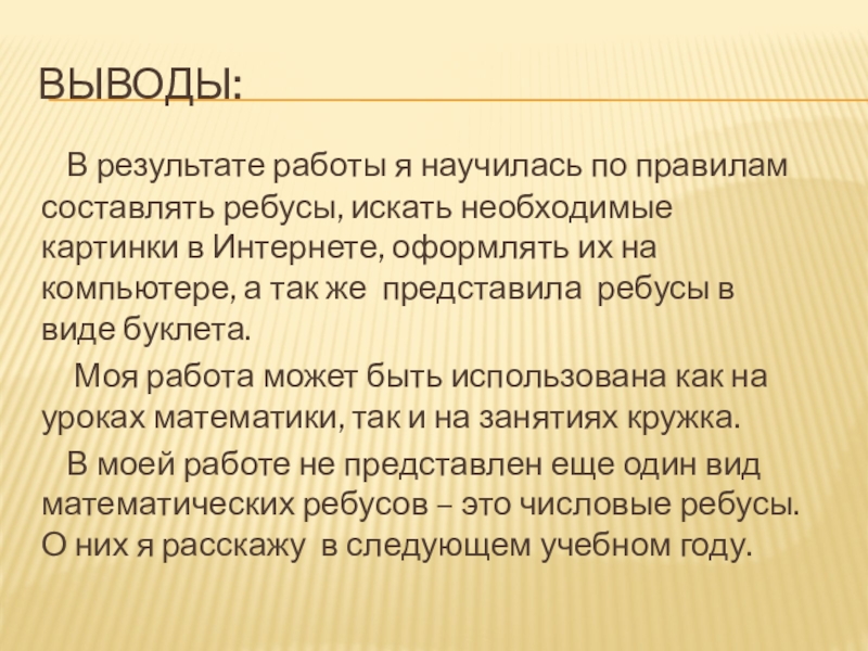 В моей работе не представлен еще один вид математических ребусов – это числовые ребусы. О них я расскажу в следующем учебном году.