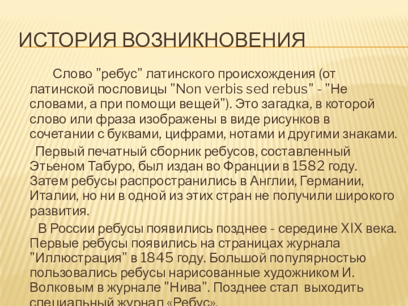 В России ребусы появились позднее - середине XlX века. Первые ребусы появились на страницах журнала "Иллюстрация" в 1845 году. Большой популярностью пользовались ребусы нарисованные художником И. Волковым в журнале "Нива". Позднее стал выходить специальный журнал «Ребус».
