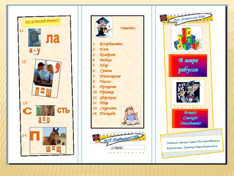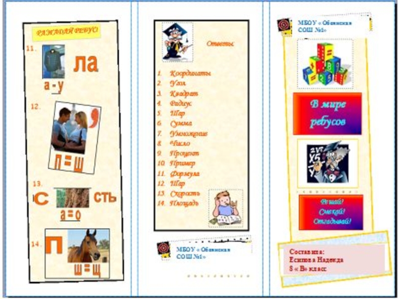 составлять ребусы, искать необходимые картинки в Интернете, оформлять их на компьютере, а так же представила ребусы в виде буклета.