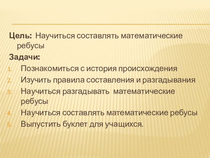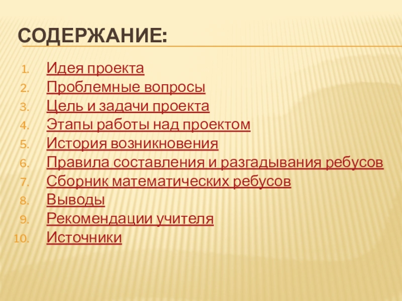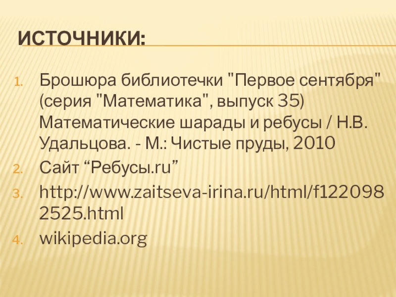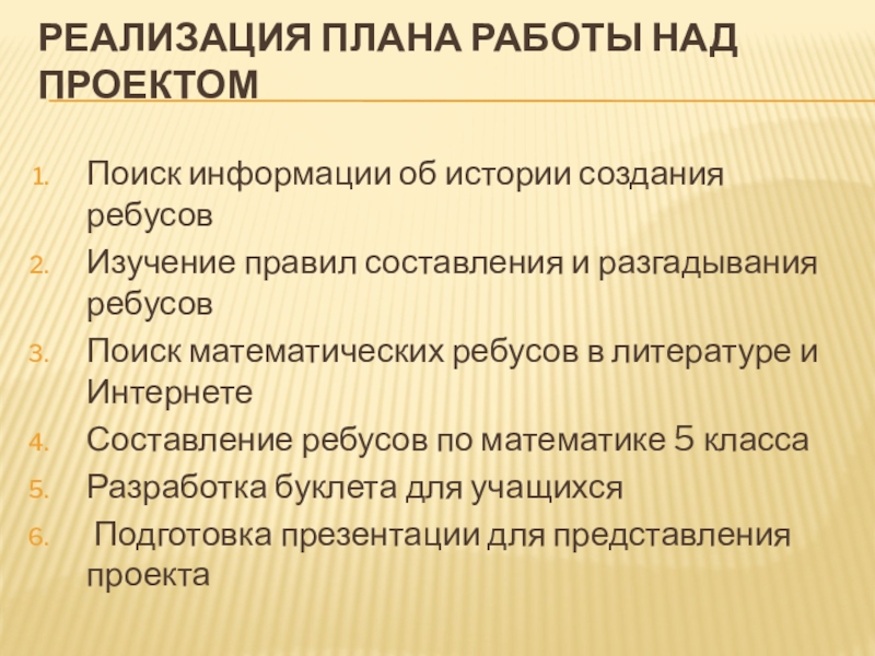 месяцев, проявив большой интерес к созданию математических ребусов и их оформлению с помощью компьютера. При написании работы была проанализирована доступная литература и интернет-ресурсы по теме проекта. В результате самостоятельно были выделены и сформулированы в краткой форме правила по составлению и разгадыванию ребусов, придуманы или подобраны конкретные примеры, иллюстрирующие эти правила.