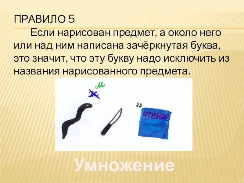 над ним написана зачёркнутая буква, это значит, что эту букву надо исключить из названия нарисованного предмета.