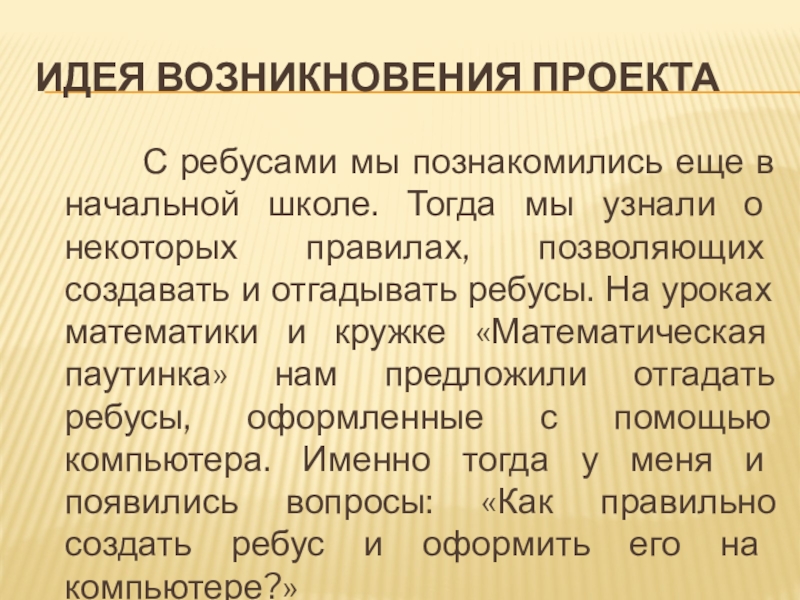 еще в начальной школе. Тогда мы узнали о некоторых правилах, позволяющих создавать и отгадывать ребусы. На уроках математики и кружке «Математическая паутинка» нам предложили отгадать ребусы, оформленные с помощью компьютера. Именно тогда у меня и появились вопросы: «Как правильно создать ребус и оформить его на компьютере?»