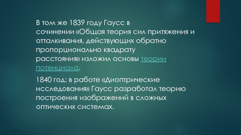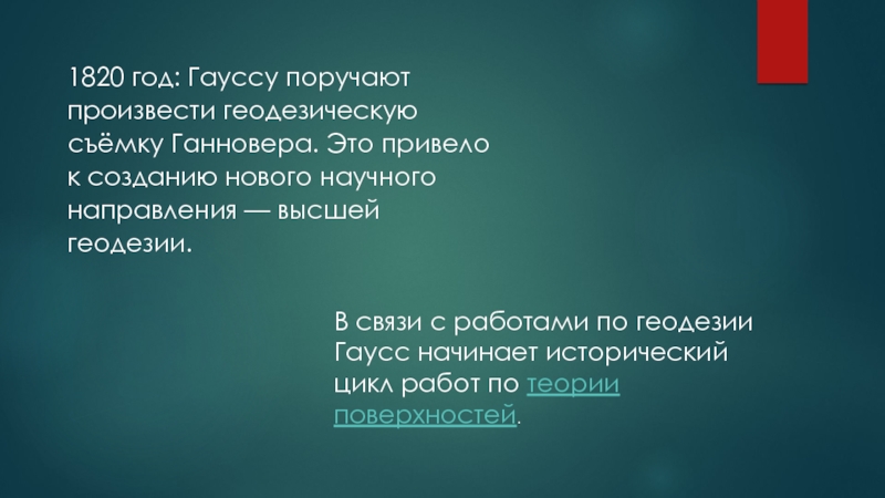 В связи с работами по геодезии Гаусс начинает исторический цикл работ по теории поверхностей.