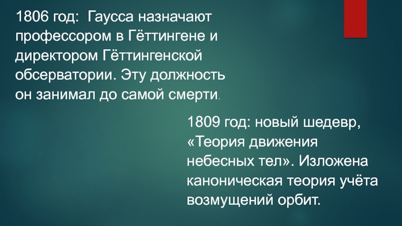 1809 год: новый шедевр, «Теория движения небесных тел». Изложена каноническая теория учёта возмущений орбит.