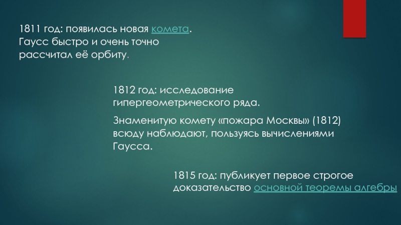 Знаменитую комету «пожара Москвы» (1812) всюду наблюдают, пользуясь вычислениями Гаусса.