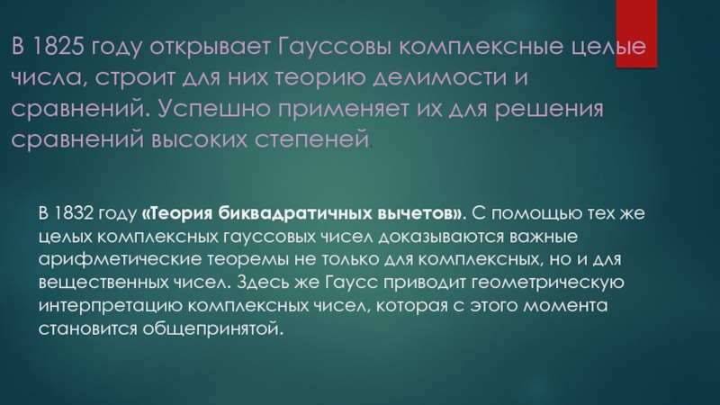 В 1832 году «Теория биквадратичных вычетов». С помощью тех же целых комплексных гауссовых чисел доказываются важные арифметические теоремы не только для комплексных, но и для вещественных чисел. Здесь же Гаусс приводит геометрическую интерпретацию комплексных чисел, которая с этого момента становится общепринятой.