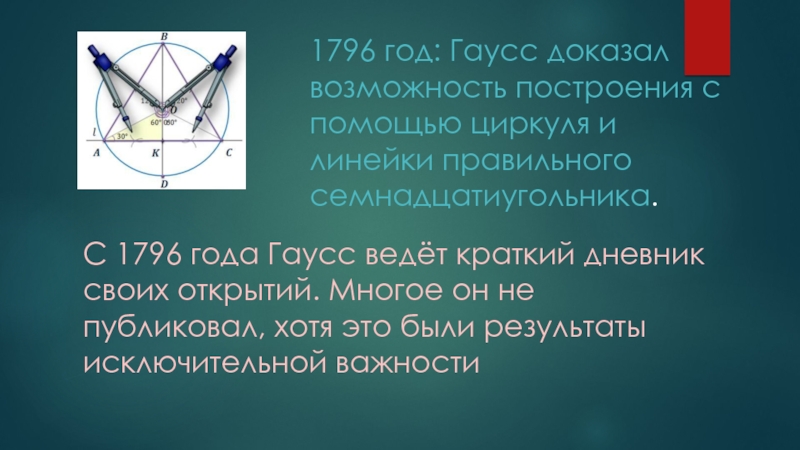 1796 год: Гаусс доказал возможность построения с помощью циркуля и линейки правильного семнадцатиугольника.