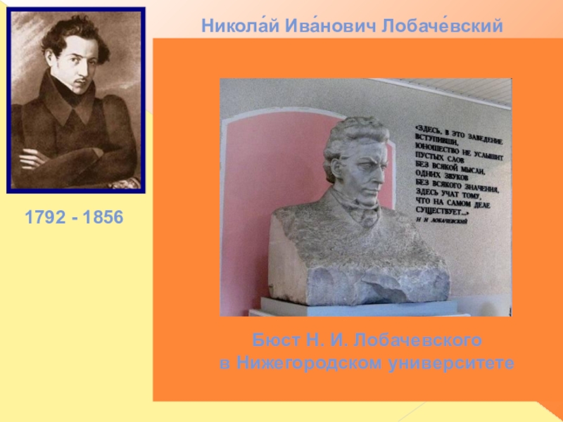 Никола́й Ива́нович Лобаче́вский Великий русский математик, создатель геометрии Лобачевского, деятель университетского образования и народного просвещения. Лобачевский издал
