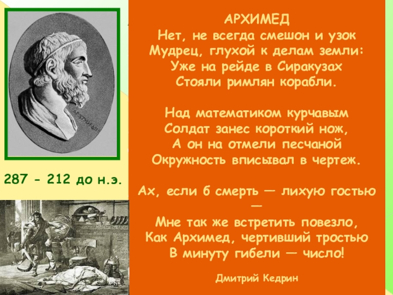 Нет, не всегда смешон и узок Мудрец, глухой к делам земли: Уже на рейде в Сиракузах Стояли римлян корабли. Над математиком курчавым Солдат занес короткий нож, А он на отмели песчаной Окружность вписывал в чертеж. Ах, если б смерть — лихую гостью — Мне так же встретить повезло, Как Архимед, чертивший тростью В минуту гибели — число!