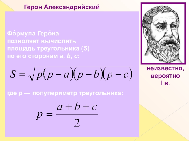 Герон Александрийский Древнегреческий ученый, математик, физик, механик, изобретатель. Математические работы Герона являются энциклопедией античной прикладной математики. В