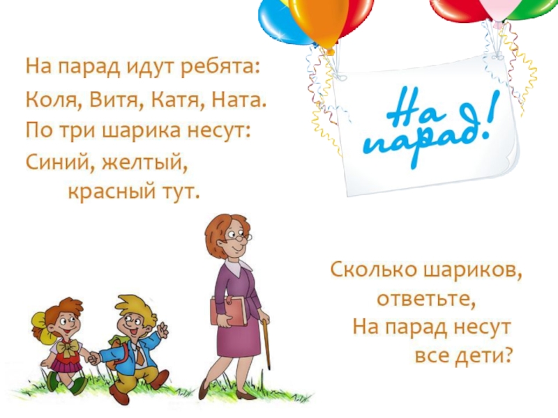 Вот задумал ёж друзейПригласить на юбилей.Пригласил двух медвежат, Трёх зайчат и пять бельчат.Посчитайте поскорей,Сколько у ежа друзей??День