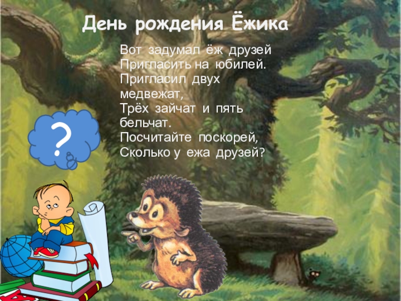 Вот задумал ёж друзейПригласить на юбилей.Пригласил двух медвежат, Трёх зайчат и пять бельчат.Посчитайте поскорей,Сколько у ежа друзей??День рождения Ёжика
