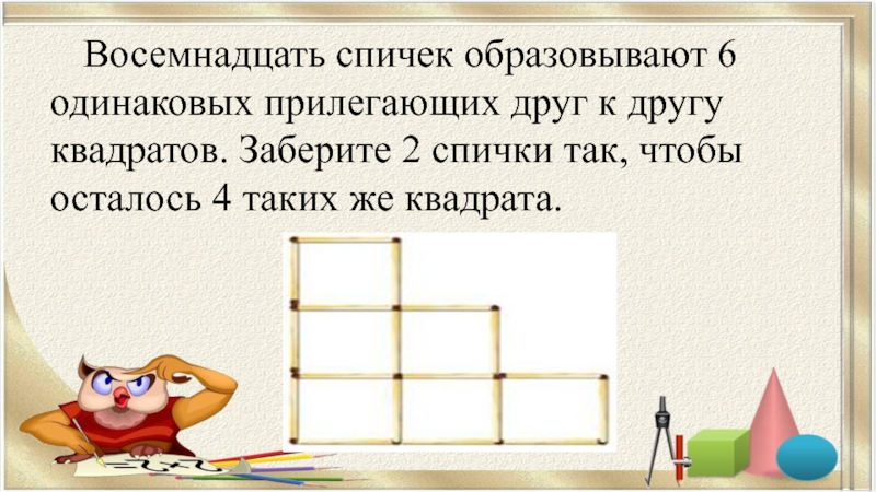 Восемнадцать спичек образовывают 6 одинаковых прилегающих друг к другу квадратов. Заберите