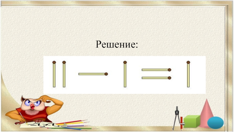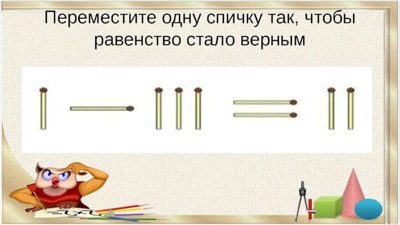Слайд 10Переместите одну спичку так, чтобы равенство стало верным