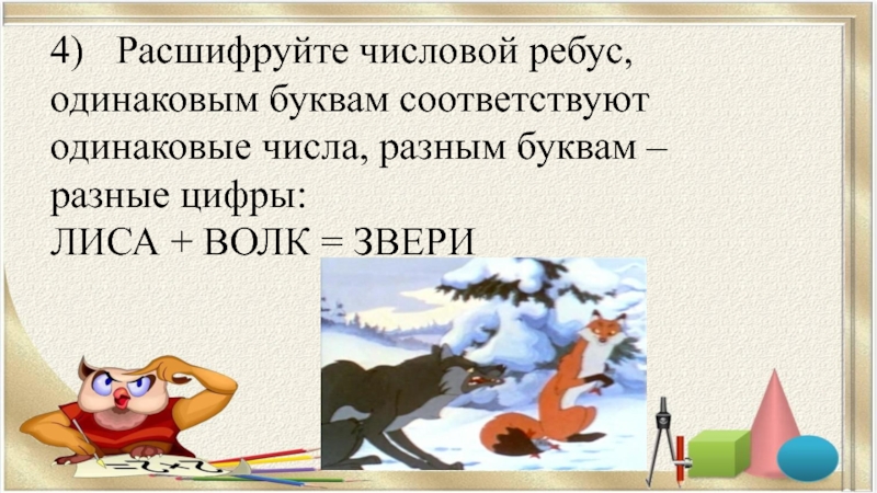 4) Расшифруйте числовой ребус, одинаковым буквам соответствуют одинаковые числа, разным буквам –