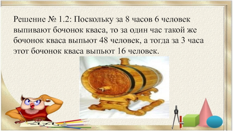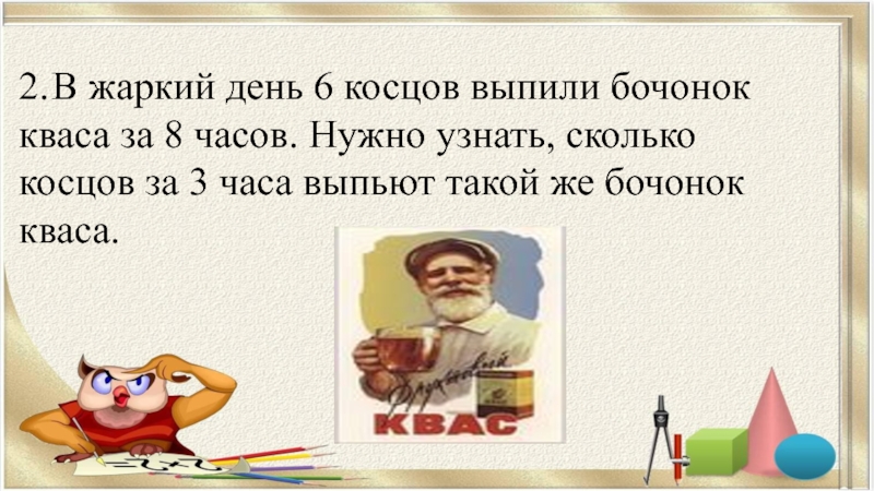 Слайд 42. В жаркий день 6 косцов выпили бочонок кваса за 8 часов.