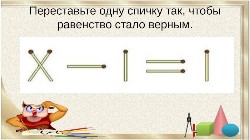 Слайд 11Переставьте одну спичку так, чтобы равенство стало верным.