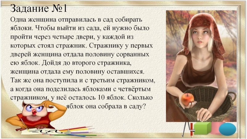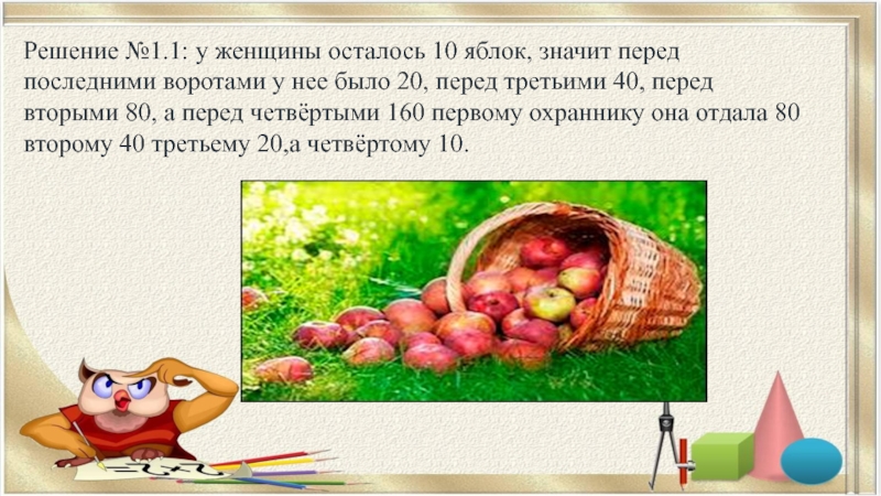 Слайд 3Решение №1.1: у женщины осталось 10 яблок, значит перед последними воротами