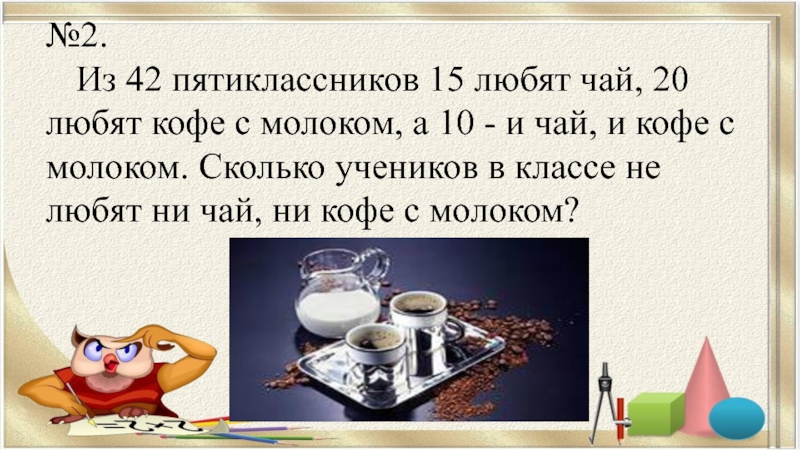 Из 42 пятиклассников 15 любят чай, 20 любят кофе с