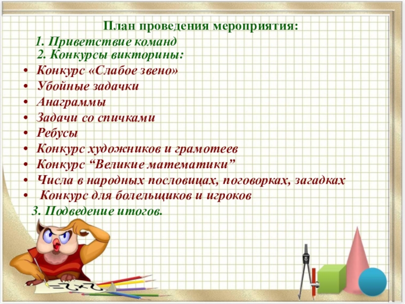 Это сайт презентаций, где можно хранить и обмениваться своими презентациями, докладами, проектами, шаблонами в формате PowerPoint с другими пользователями. Мы помогаем школьникам, студентам, учителям, преподавателям хранить и обмениваться учебными материалами.