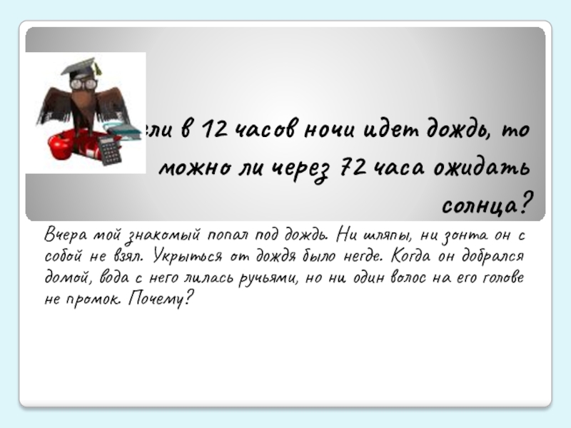 Вчера мой знакомый попал под дождь. Ни шляпы, ни зонта он с собой не взял. Укрыться от дождя было негде. Когда он добрался домой, вода с него лилась ручьями, но ни один волос на его голове не промок. Почему?