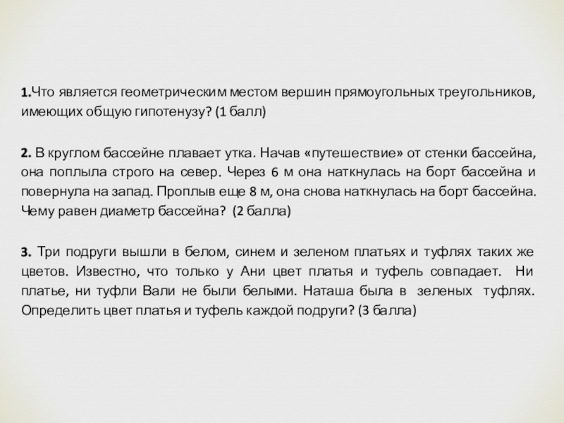 1.Что является геометрическим местом вершин прямоугольных треугольников, имеющих общую гипотенузу? (1 балл)2. В круглом бассейне плавает утка. Начав