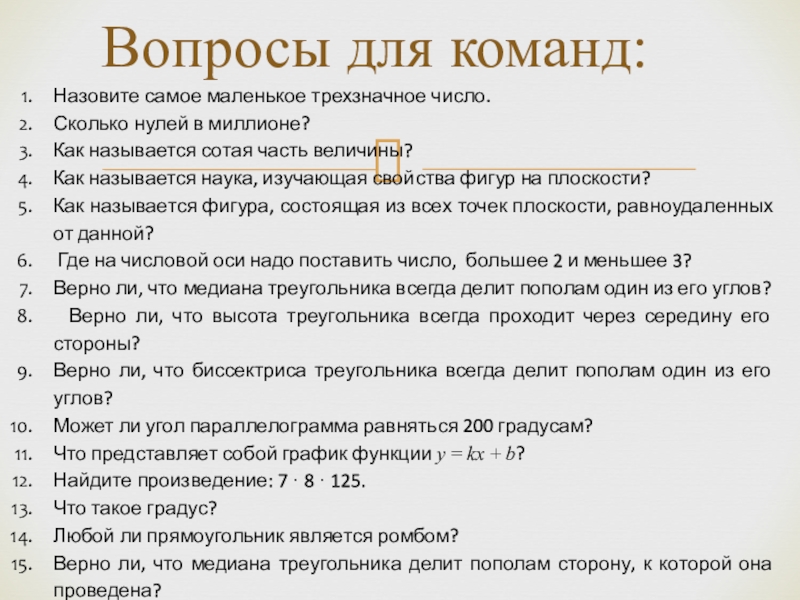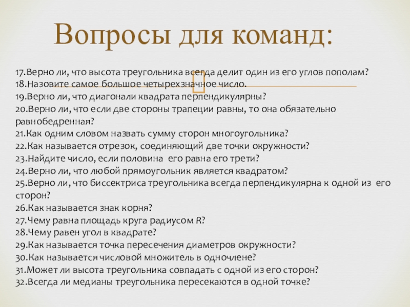 Вопросы для команд: 17.Верно ли, что высота треугольника всегда делит один из его углов пополам?