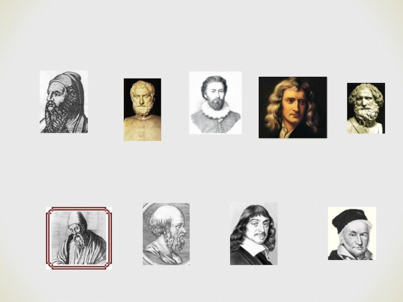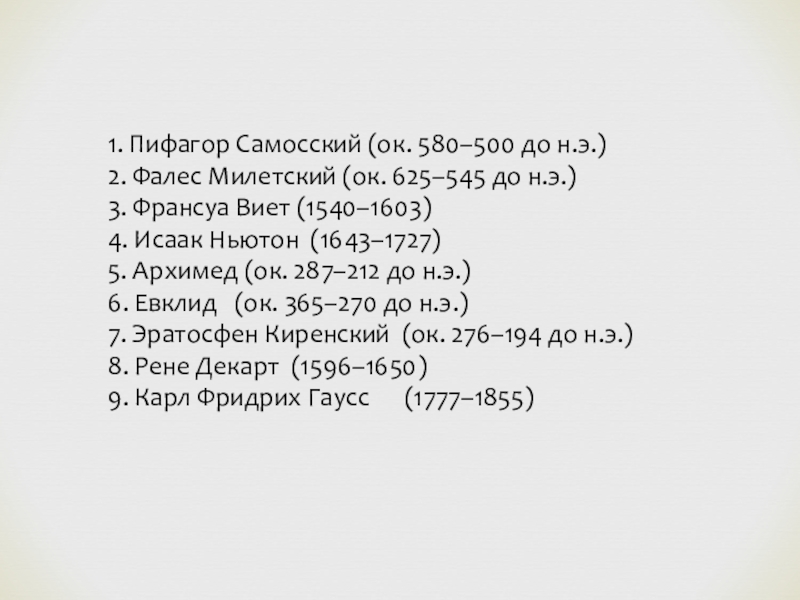 1. Пифагор Самосский (ок. 580–500 до н.э.)2. Фалес Милетский (ок. 625–545 до н.э.)3. Франсуа Виет (1540–1603)4. Исаак Ньютон (1643–1727)5. Архимед (ок.