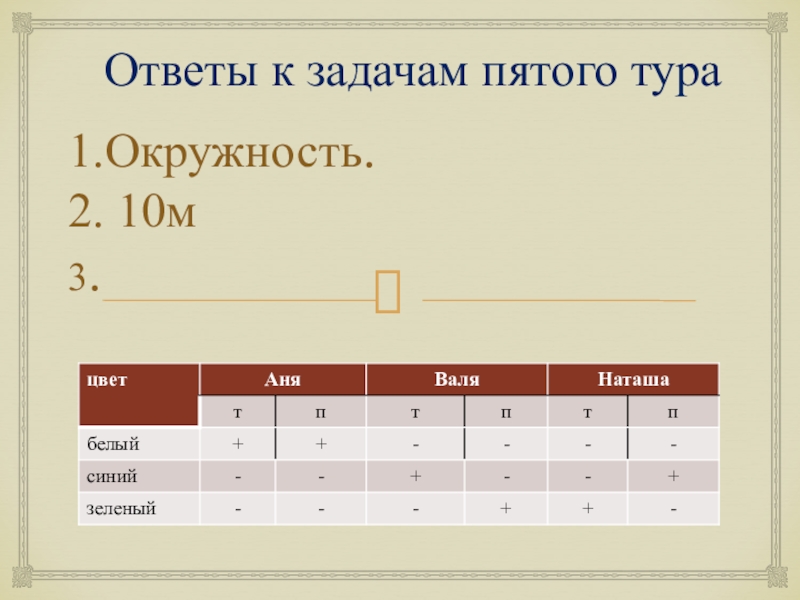 1.Окружность. 2. 10м 3.Ответы к задачам пятого тура