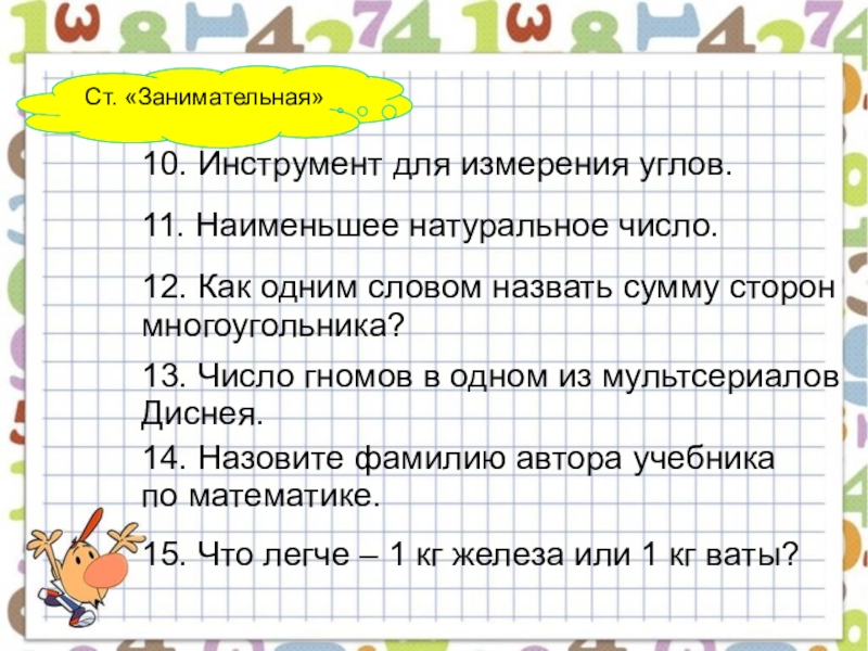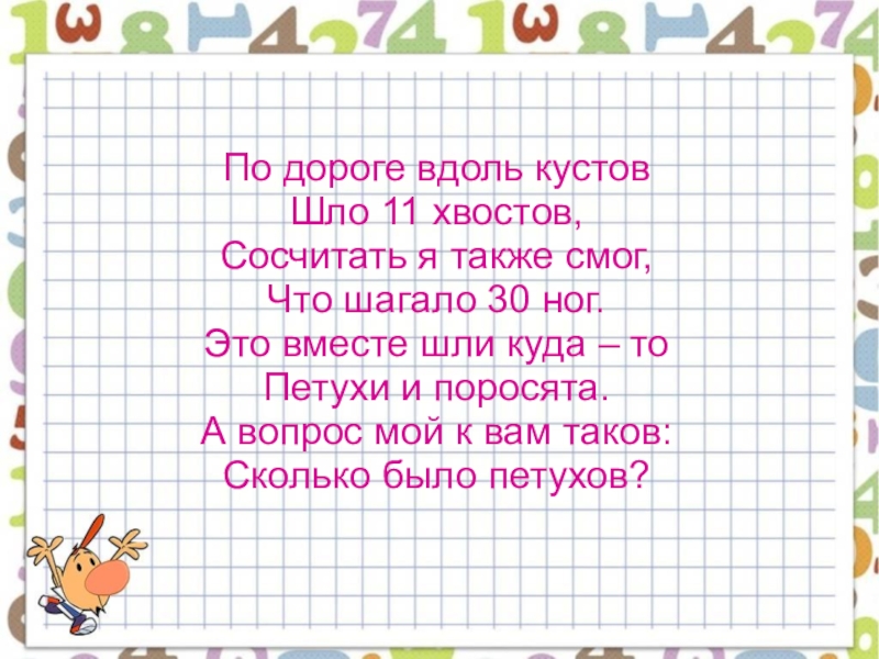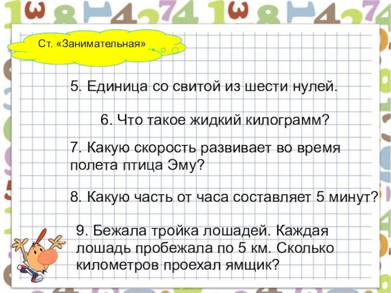 9. Бежала тройка лошадей. Каждая лошадь пробежала по 5 км. Сколько километров проехал ямщик?