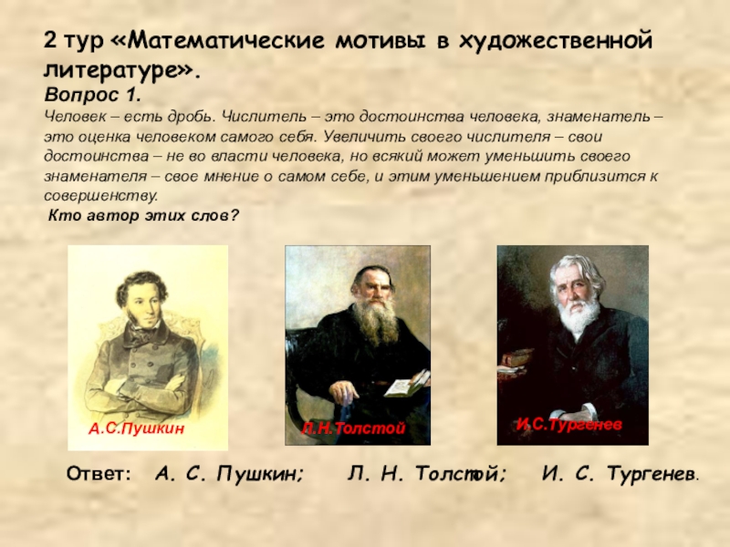 Ответ: А. С. Пушкин; Л. Н. Толстой; И. С. Тургенев.