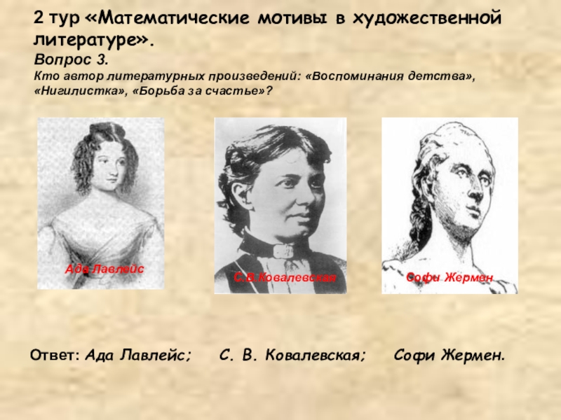 Ответ: Ада Лавлейс; С. В. Ковалевская; Софи Жермен.