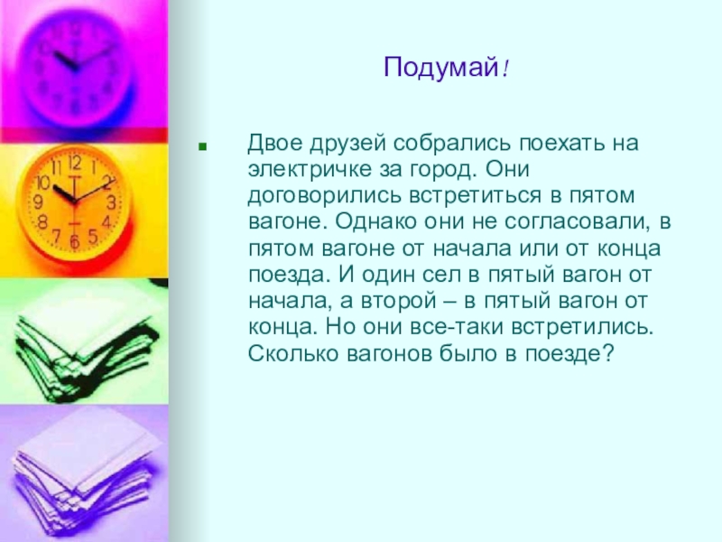 в пятом вагоне. Однако они не согласовали, в пятом вагоне от начала или от конца поезда. И один сел в пятый вагон от начала, а второй – в пятый вагон от конца. Но они все-таки встретились. Сколько вагонов было в поезде?