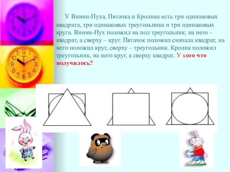 три одинаковых треугольника и три одинаковых круга. Винни-Пух положил на пол треугольник, на него – квадрат, а сверху – круг. Пятачок положил сначала квадрат, на него положил круг, сверху – треугольник. Кролик положил треугольник, на него круг, а сверху квадрат. У кого что получилось?
