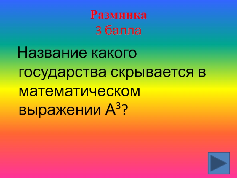 Разминка 3 балла  Название какого государства скрывается в математическом выражении А3?