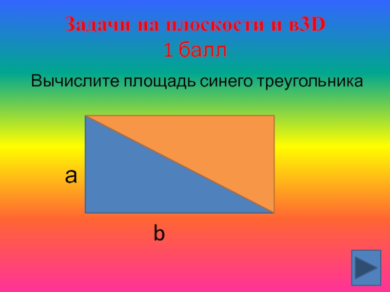 Задачи на плоскости и в3D 1 балл Вычислите площадь синего треугольникааb