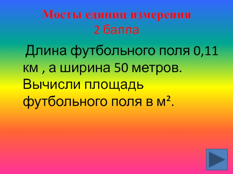 Мосты единиц измерения 2 балла   Длина футбольного поля 0,11км , а ширина 50 метров. Вычисли