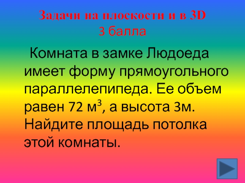 Задачи на плоскости и в 3D  3 балла   Комната в замке Людоеда имеет форму