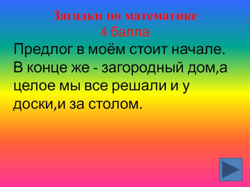 Загадки по математике 4 баллаПредлог в моём стоит начале.В конце же - загородный дом,а целое мы все