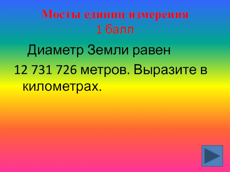 Мосты единиц измерения 1 балл   Диаметр Земли равен 12 731 726 метров. Выразите в километрах.