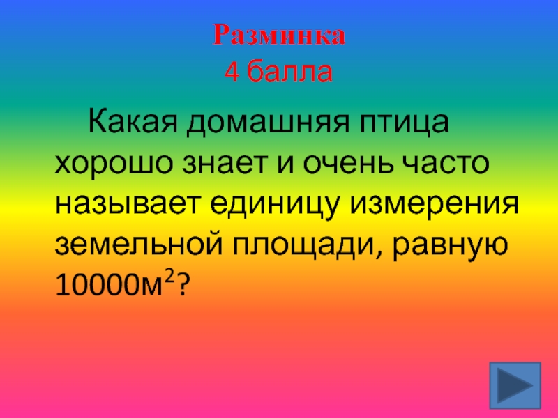 Разминка 4 балла    Какая домашняя птица хорошо знает и очень часто называет единицу измерения
