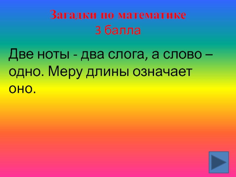 Загадки по математике 3 баллаДве ноты - два слога, а слово – одно. Меру длины означает оно.