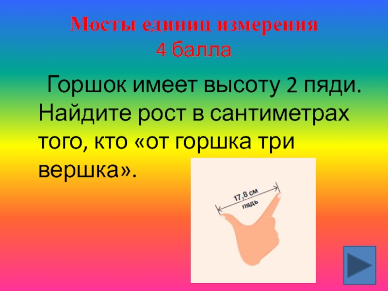 Мосты единиц измерения 4 балла    Горшок имеет высоту 2 пяди. Найдите рост в сантиметрах